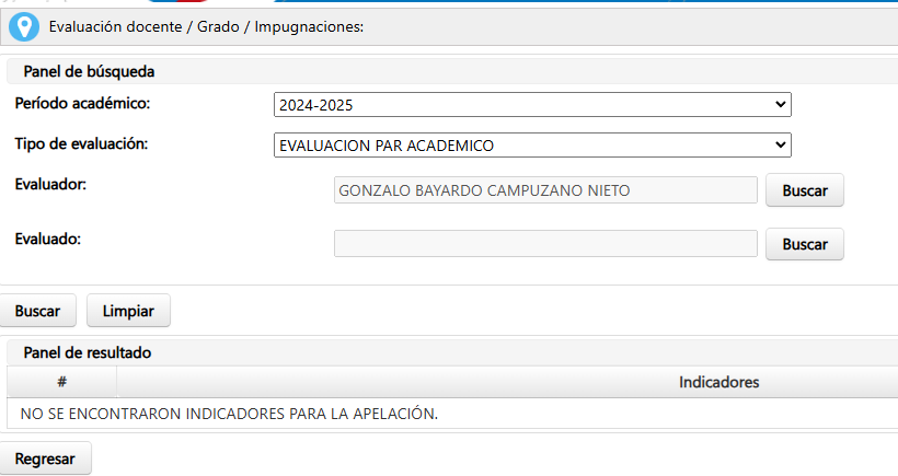 Favor revisar el siguiente caso: El Director de Carrera con usuario icnaula intentar registrar la impugnación del par académico y al buscar el docente evaluado, no existe respuesta por parte del sistema, se ha revisado mediante la opción Evaluación docente/Grado/Impugnaciones, la identificación del coordinador del área es 1708459118 y la identificación de la docente que impugna es 1719285734