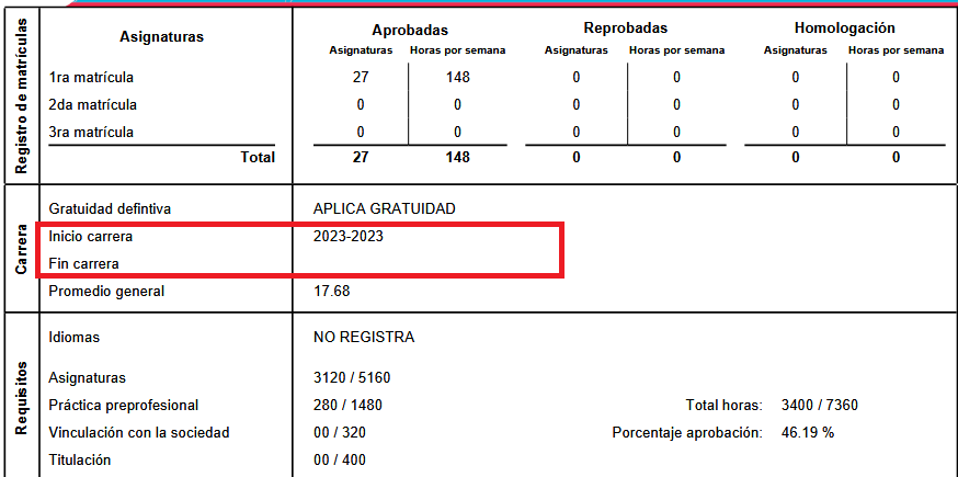 Una vez agregados los procesos Finalización del período académico y Finalización del período académico con Recuperación, se requiere que en la sección Carrera del Reporte del Récord académico con resumen por carrera en los campos Inicio carrera se despliegue la fecha del proceso INICIO CLASES y en el campo Fin carrera se despliegue la fecha del proceso Finalización del período académico con recuperación