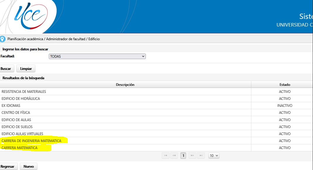 Favor desactivar los siguientes edificios: CARRERA DE INGENIERIA MATEMÁTICA y CARRERA MATEMÁTICA en la facultad de Ciencias Aplicadas