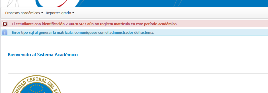 Favor revisar a partir del día de hoy al realizar las pruebas de matrículas se despliega el mensaje: "Error tipo sql al generar la matrícula, comuníquese con el administrador del sistema, se ha revisado con los siguientes estudiantes: 2300787427 pequinonez, 1729217222 mscarvajalc, 1751559095 esduqueo, 1751223494 alyunganv1
