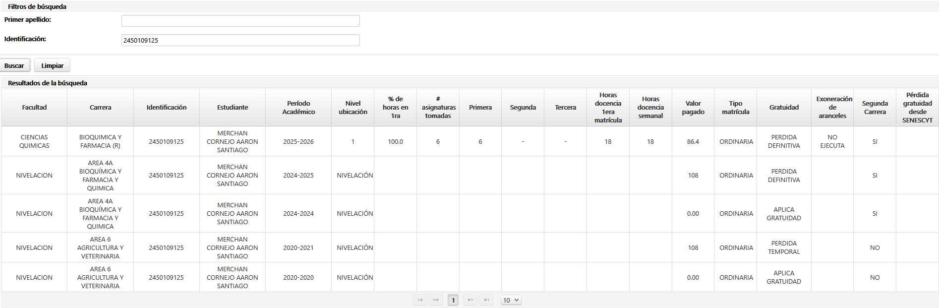 Favor habilitar la gratuidad del estudiante con identificación No. 2450109125, pedido realizado mediante ticket Tareas - Mant. adaptativo #7512 Oficio Nro. UCE-DGA-2025-2240-O. Eliminar el SI del campo segunda carrera en el período académico 2025-2026