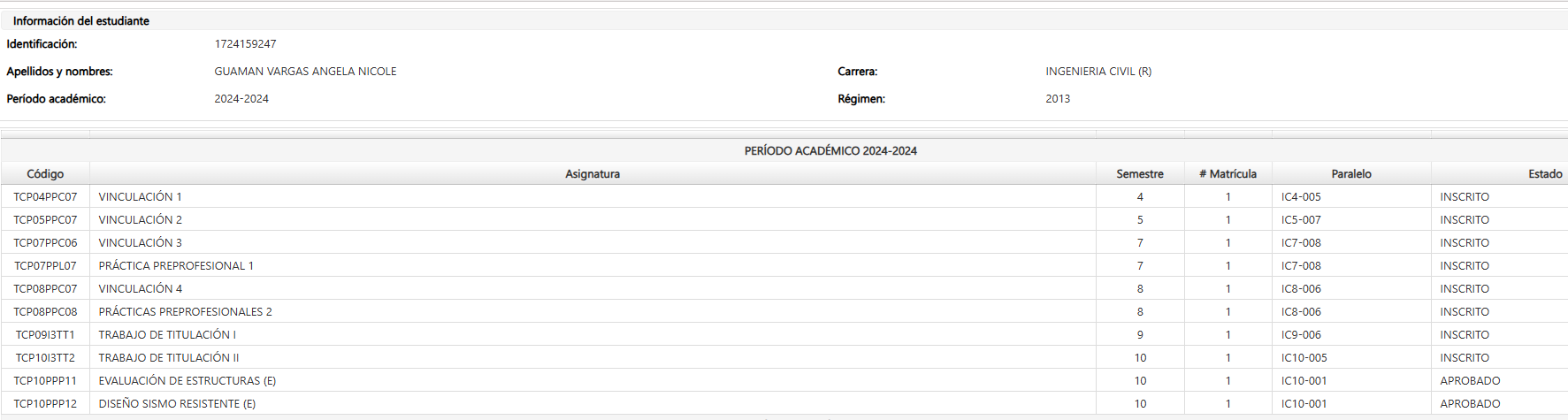 Favor cambiar a estado matriculado las siguientes asignatura que pertenecen a espacios curriculares de la estudiante con identificación No. 1724159247 GUAMÁN VARGAS ANGELA NICOLE de la carrera de Ingeniería Civil