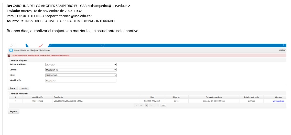 Estimado Marcelo por favor tú ayuda con lo que solicitan cambiar el estado de la estudiante: Laura Nerea Valverde Rivera con CI. 1723137434 del paralelo M11-008 de inactivo a activo
