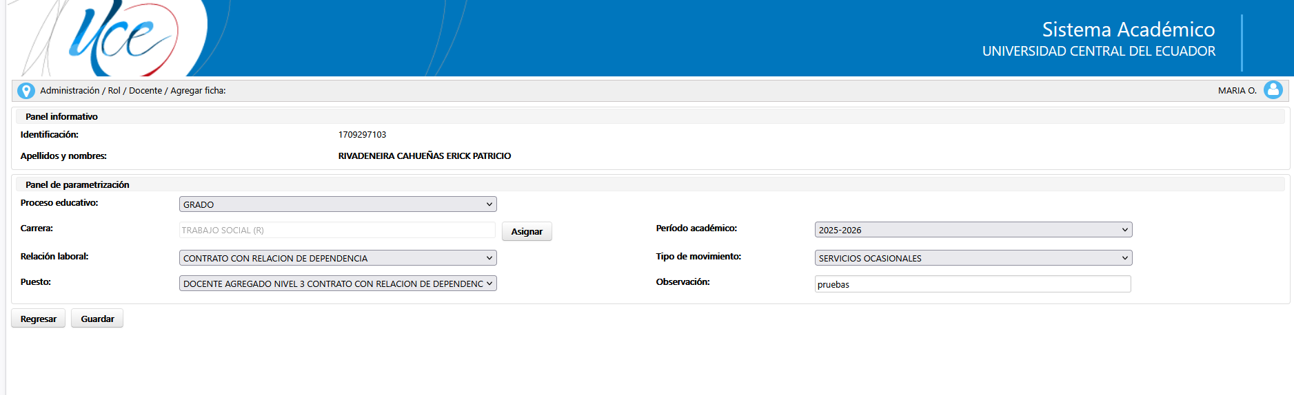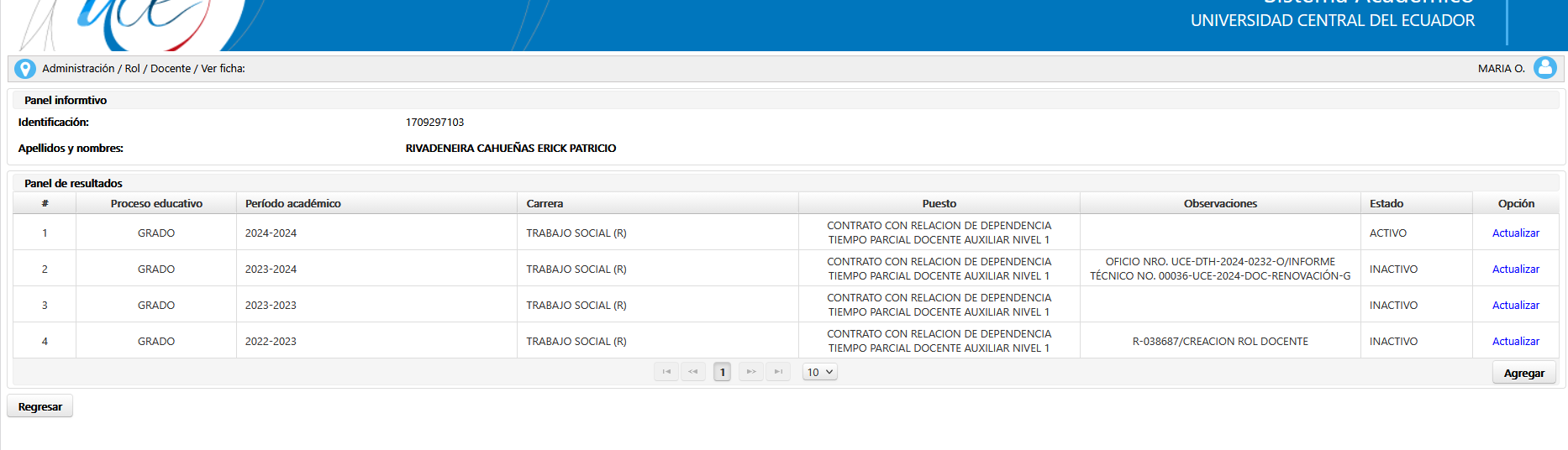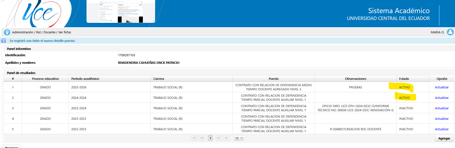 Estimado Freddy, al actualizar los perfiles de los docentes desde la opción de soporte técnico, se registra pero quedan activos los dos movimientos el antiguo y el nuevo.